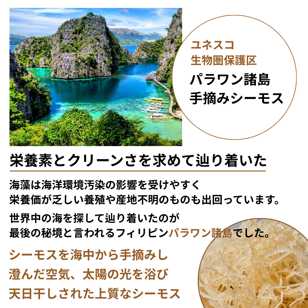 海の世界遺産があるパラワン島の高品質なシーモスを、手摘み→天日干し→無添加製法という、自然への敬意がつまった工程でつくられています。